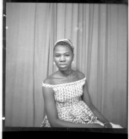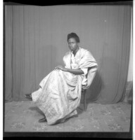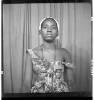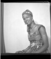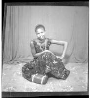 448. EAP449/2/26/448 Reference (shelfmark): EAP449/2/26/448 Title: A woman wearing a camisole, necklace, earrings, and a white head wrap sitting face-forward in the studio. Collection Area: Endangered Archives Programme Languages: Not applicable Date Range: 2nd half od the 20th century Extent: 1 TIFF image
