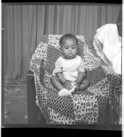 447. EAP449/2/26/447 Reference (shelfmark): EAP449/2/26/447 Title: A baby laying face-forward on a chair and fabric, wearing a t-shirt, shirt, white head wrap, and white shorts in the studio. Collection Area: Endangered Archives Programme Languages: Not applicable Date Range: 2nd half od the 20th century Extent: 1 TIFF image