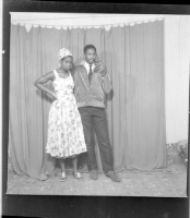A couple standing, a young girl wearing a dress and hairstyle and earrings and necklace with a man wearing a white dress shirt and grey jacket with a pipe in the studio.