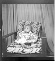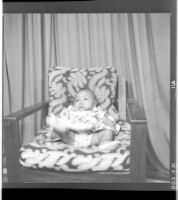 497. EAP449/2/26/497 Reference (shelfmark): EAP449/2/26/497 Title: A baby laying face-forward on a chair wearing black and white in the studio. Collection Area: Endangered Archives Programme Languages: Not applicable Date Range: 2nd half od the 20th century Extent: 1 TIFF image