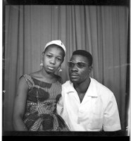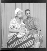 A man wearing a black long-sleeved shirt, a watch, a ring, and black glasses sitting face-forward with a woman wearing a camisole, head wrap, necklace, and black pagne with a baby wearing all black in the studio.