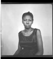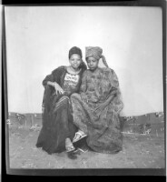 Two women sitting face-forward on chairs, the one on the right wearing a black boubou, a black head wrap, and earrings smiling with her legs crossed, and the one on the left wearing a black boubou and head wrap sitting with her legs crossed in the studio.