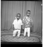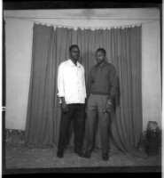 Two men standing face-forward, the one on the right wearing a white shirt, black pants, and black shoes, and the one on the left wearing a black coat and a watch with a cigarette in his hand in the studio.