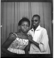 A young girl wearing a camisole and earrings with her hair styled sitting face-forward with a young man wearing a white long-sleeved shirt and black glasses in the studio.