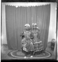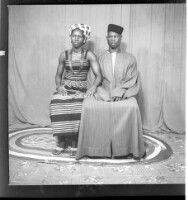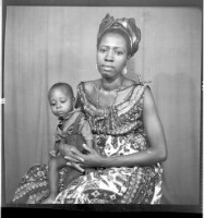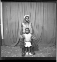 A woman wearing a camisole, white head wrap, earrings, and a necklace sitting face-forward on a chair with a little boy wearing a t-shirt and white shorts standing in the studio.