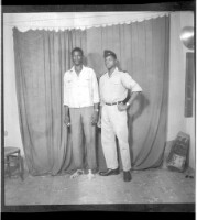 Two men standing face-forward, one wearing a white cosmopolitan ""Deux Poches"" (""Two Pockets"") shirt, black pants, and a watch, and the other wearing a police uniform in the studio.
