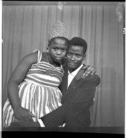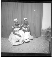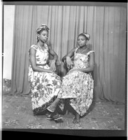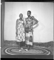 Two young girls standing face-forward on a mat, the one on the right wearing a dress, head wrap, a necklace, earrings, and a bracelet, and the one on the left wearing a camisole, pagne, and a watch with her hair styled and her left hand on her hip in the