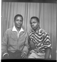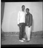Tow young men standing face-forward, the one on the right wearing a white shirt, black pants, and white shoes, and the one on the left wearing a black shirt and white pants in the studio.