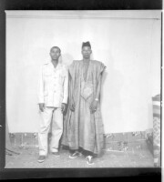Two men standing face-forward, the one on the right wearing a white shirt with four pockets, black pants, and white shoes, and the one on the left wearing a large boubou, a watch, and a black fez in the studio.