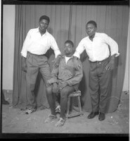 A man wearing a shirt and shorts sitting in profile between two other men wearing shirts and pants, both standing, one face-forward and the other in profile in the studio.