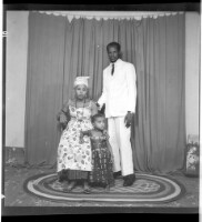 A man wearing a suit and tie standing face-forward next to a woman wearing a dress, head wrap, and necklace sitting face-forward with a little girl standing face-forward beside them in the studio.