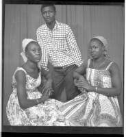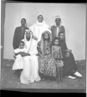 A woman wearing a dress and head wrap sitting face-forward between two men wearing boubous, one wearing a scarf, both sitting in profile with two little girls standing face-forward beside them, all in front of three men wearing boubous, two with hats, sta