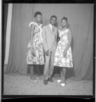 A man wearing a suit and tie standing in profile in between two girls wearing dresses and necklaces both standing, one face-forward and the other in profile in the studio.