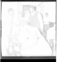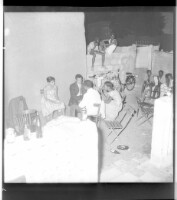 Two young girls wearing dresses with their hair styled with two men wearing white shirts and black suits, next to two bicycles; on the wall two little boys are wearing shirts and white t-shirts and sitting, with three other little boys sitting in the back