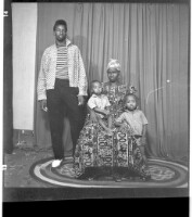 A man wearing a shirt and pants standing face-forward next to a woman wearing a dress, head wrap, and necklace sitting face-forward holding a little boy on her lap with another little boy by her side in the studio.