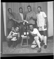 Seven young athletes standing with a trophy; four men standing in front, the one on the right wearing a black short-sleeved shirt and smiling, next to one wearing a black suit, one wearing a black long-sleeved shirt, and another wearing a white shirt, whi