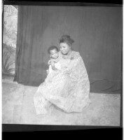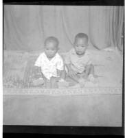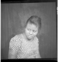 Full shot of two young girls standing, on the left a young girl wearing a camisole and pagne and hairstyle and earrings and on the right a girl wearing a black dress and hairstyle in the studio.