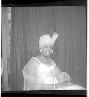 142. EAP449/2/27/142 Reference (shelfmark): EAP449/2/27/142 Title: A woman sitting wearing a camisole and large white boubou, necklace, and earrings and headscarf, smiling, arms crossed in the studio in profile. Collection Area: Endangered Archives Programme Languages: Not applicable Date Range: 2nd half od the 20th century Extent: 1 TIFF image