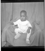 146. EAP449/2/27/146 Reference (shelfmark): EAP449/2/27/146 Title: Full shot of a baby laying on a curtain in a grey t-shirt and white shorts, amulets and headscarf in the studio. Collection Area: Endangered Archives Programme Languages: Not applicable Date Range: 2nd half od the 20th century Extent: 1 TIFF image