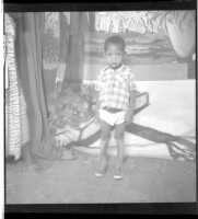 Full shot of two babies sitting on a rug, on the right wearing a black and white shirt and on the left wearing a black t-shirt and shorts in the studio.