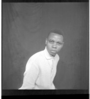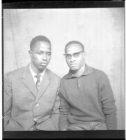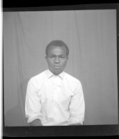 Full shot of four young men standing, on the right wearing a white shirt, pants, and black shoes, hand on his hip, next to him a young man wearing a grey shirt and black pants and shoes, in the middle wearing a long sleeved shirt and