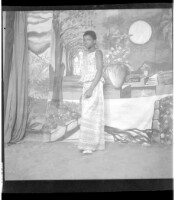 182. EAP449/2/27/182 Reference (shelfmark): EAP449/2/27/182 Title: A girl in a dress and pagne standing in profile in the studio. Collection Area: Endangered Archives Programme Languages: Not applicable Date Range: 2nd half od the 20th century Extent: 1 TIFF image