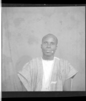 184. EAP449/2/27/184 Reference (shelfmark): EAP449/2/27/184 Title: A man sitting wearing a blue and white boubou in the studio facing forward. Collection Area: Endangered Archives Programme Languages: Not applicable Date Range: 2nd half od the 20th century Extent: 1 TIFF image