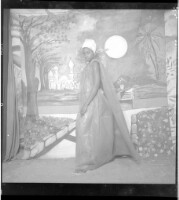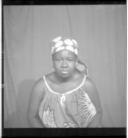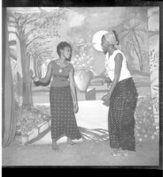 Full shot of two young girls standing, on the right a young girl wearing a dress and headscarf and on the left a young girl wearing a dress, holding her hands together, facing each other in the studio.