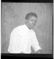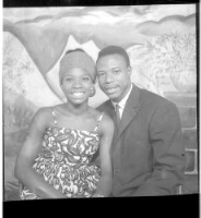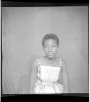 Two young girls standing, one facing forward wearing a black t-shirt, pagne, earrings, watch, and hairstyle, left arm raised, on the left a young girl standing in profile wearing a white t-shirt and black pagne, hairstyle, earrings, and headscarf, smiling
