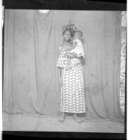 221. EAP449/2/27/221 Reference (shelfmark): EAP449/2/27/221 Title: Full shot of a woman standing wearing a headscarf and earrings, holding a little girl in her arms wearing a camisole and shorts in the studio. Collection Area: Endangered Archives Programme Languages: Not applicable Date Range: 2nd half od the 20th century Extent: 1 TIFF image