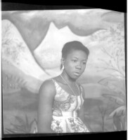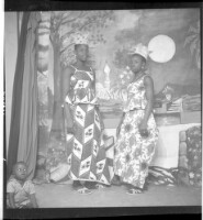 229. EAP449/2/27/229 Reference (shelfmark): EAP449/2/27/229 Title: Full shot of two young girls standing facing each other, on the right wearing a camisole, pagne, headscarf, and earrings and on the left wearing a camisole, pagne, dress, headscarf, necklace, and earrings in profile in the studio. Collection Area: Endangered Archives Programme Languages: Not applicable Date Range: 2nd half od the 20th century Extent: 1 TIFF image