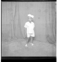 309. EAP449/2/27/309 Reference (shelfmark): EAP449/2/27/309 Title: A little boy in a dress shirt, shorts, and headscarf standing in profile in the studio. Collection Area: Endangered Archives Programme Languages: Not applicable Date Range: 2nd half od the 20th century Extent: 1 TIFF image