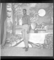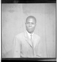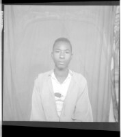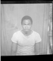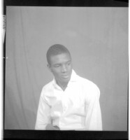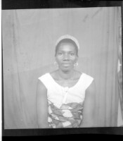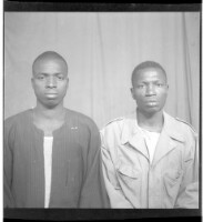 A couple sitting, on the right a woman in a camisole and headscarf and white a man sitting wearing a grey short sleeved shirt with a pen in the pocket in the studio.