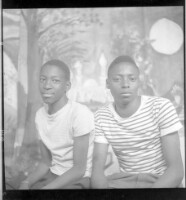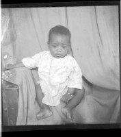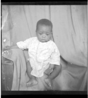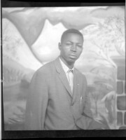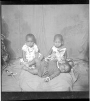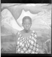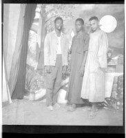 Full shot of three people standing, on the right ta man wearing a dress shirt and pants and in the middle a young girl wearing a dress and headscarf and earrings and on the left a man wearing a grey short sleeved shirt and watch and glasses in the studio