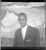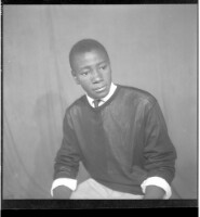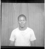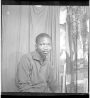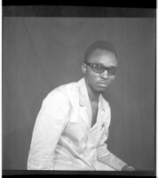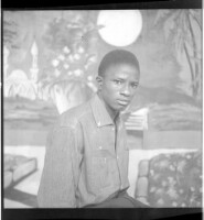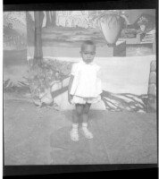 A little boy in a dress shirt and shorts next to a little girl, both standing facing forward in front of three girls in dresses and pagnes, one holding a baby in her hands, both standing in profile in the studio.