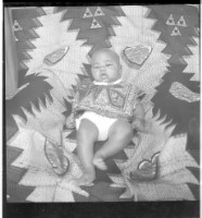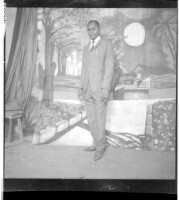 A young couple standing, on the left a girl in a white shirt and skirt and headscarf and a man in a suit and tie, in the background four men standing and a young girl in profile in the studio.