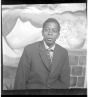 407. EAP449/2/27/407 Reference (shelfmark): EAP449/2/27/407 Title: A man in a jacket and tie and pants standing facing forward next to a girl in a woman's jacket and a skirt holding a bag and wearing necklaces in profile in the studio. Collection Area: Endangered Archives Programme Languages: Not applicable Date Range: 2nd half od the 20th century Extent: 1 TIFF image