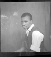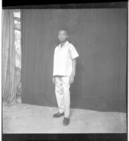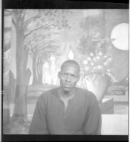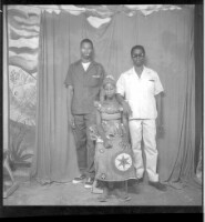 A woman in a dress, pagne, and headscarf sitting in front of two men in dress shirts and pants, one wearing glasses and a cigarette in the mouth of the other. Both standing facing forward in the studio.