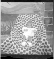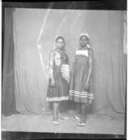 Full shot of two little girls, one standing wearing a dress and hairstyle and earrings and one sitting on a run wearing a dress and shoes in the studio.