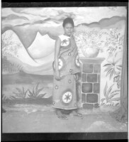 Full shot of two young girls standing, on the left wearing a camisole and pagne and on the right wearing a camisole and black and white pagne in the studio.