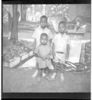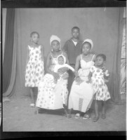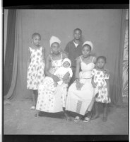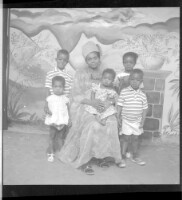 Four people, a woman sitting wearing a camisole and pagne, headscarf, earrings, and holding a baby, and a man wearing a grey shirt and watch sitting holding a little boy in a t-shirt and shorts in the studio.