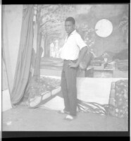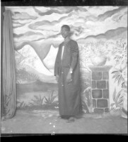 445. EAP449/2/27/445 Reference (shelfmark): EAP449/2/27/445 Title: A man standing wearing a white shirt and black suit and black pants, smiling, arm on his knee in the studio in profile. Collection Area: Endangered Archives Programme Languages: Not applicable Date Range: 2nd half od the 20th century Extent: 1 TIFF image