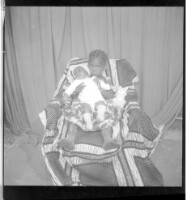 441. EAP449/2/27/441 Reference (shelfmark): EAP449/2/27/441 Title: Full shot of three, a woman sitting wearing a grey boubou and headscarf with two little boys standing on her either side wearing black and white boubous. Collection Area: Endangered Archives Programme Languages: Not applicable Date Range: 2nd half od the 20th century Extent: 1 TIFF image