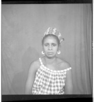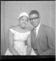 Full shot of three people, on the left a man sitting wearing a white boubou with a portable radio in a bag and a woman sitting wearing a black boubou, necklace, headscarf, earrings, and a man standing in the middle wearing a shirt and large black boubou a
