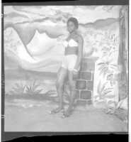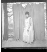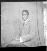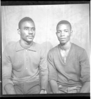 Full shot of three young men standing, on the left wearing a white dress shirt and black suit and in the middle a young man standing wearing a suit and tie and on the right wearing a white shirt and black suit and white pants and black shoes in the studio
