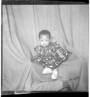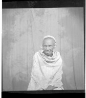 Full shot of a couple, on the left a woman sitting wearing a dress and headscarf with a man sitting wearing a black shirt, glasses, grey Fez, with a cigarette in his mouth in the studio.