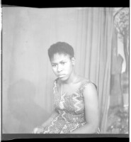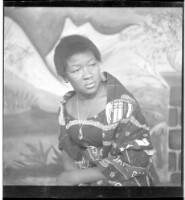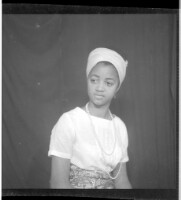 Full shot of four people, on the left a woman sitting wearing a camisole and black pagne, in the middle a little girl standing wearing a dress and on the right a woman sitting wearing a camisole, necklace, headscarf, and arms crossed. A man standing in th