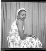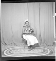 110. EAP449/2/28/110 Reference (shelfmark): EAP449/2/28/110 Title: A woman wearing a dress, pagne, necklace, and earrings sitting face-forward on a chair in the studio. Collection Area: Endangered Archives Programme Languages: Not applicable Date Range: 2nd half od the 20th century Extent: 1 TIFF image