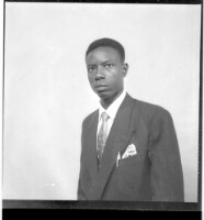 104. EAP449/2/28/104 Reference (shelfmark): EAP449/2/28/104 Title: A man wearing a suit, jacket, and tie standing in profile in the studio. Collection Area: Endangered Archives Programme Languages: Not applicable Date Range: 2nd half od the 20th century Extent: 1 TIFF image