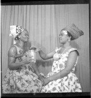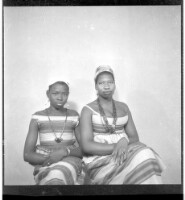 Two young women wearing matching camisoles, black and white pagnes, necklaces, and head wraps sitting with their arms and legs crossed in profile and face-forward in the studio.